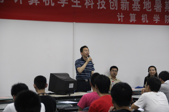 刘贺老师总结了集训的筹备情况。今年暑期集训得到了学校相关部门的大力支持,经过近两个月的准备,共有来自计算机学院、自动化学院和信息学院的131名同学报名参加,其中12级学生71人,11级学生25人,10级学生15人,ACM集训队20人。共收到教师提供项目20余个,结成创新项目小组8组。他对参训同学做了安全教育,特别强调了警惕用电安全、营造良好学习氛围、注意个人和环境卫生等事项。