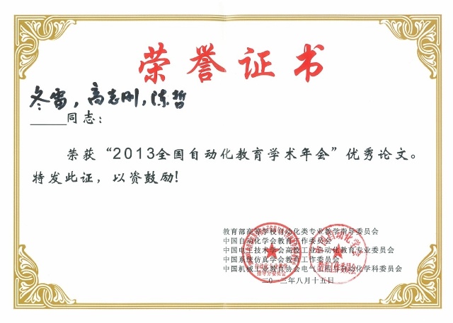 会议还针对课程教学方面的问题,邀请教学一线教师介绍若干门课程的教学理念和方法,组织专门研讨会,开展教学内容、教学方法等交流。ob真人自动化学院彭熙伟、汪湛清、高琪、崔灵果、冬雷、姚分喜、张婷等主笔的7篇教学研究论文被大会录用。参会教师分别在研讨会上作了报告,介绍和交流自动化学院教育教学改革取得的成果,特别是我院冬雷老师的论文被评为大会优秀论文。