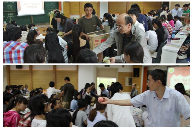 最后,伴随着结束的音乐声,学院为每一位新生带来一份祝福、一份惊喜。书记、院长及所有到会老师将稻香村的月饼和红富士的苹果发到了新生的手中,浓浓的情意和温馨的祝福让所有的新生感觉到外国语学院这个大家庭的温暖与情意。