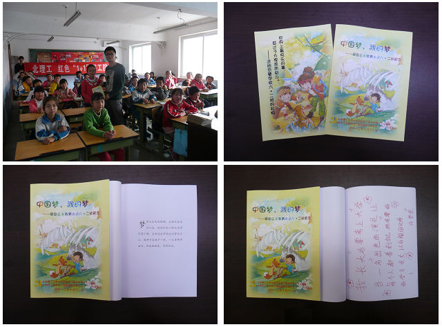 中午时分,两支部大学生党员到达了北京京蓼小学。京蓼小学位于京郊房山区良乡肖庄村,是一所民办打工子弟学校,办学条件比较艰苦。两支部大学生党员首先为六年级2班的同学们送去了他们精心制作的《中国梦,我的梦》纪念册,该纪念册是上次支教活动结束后基于小学生们以文字、图画形式表达出来的“梦想”,加上两支部大学生党员的寄语与精美封面制作而成的。小学生们接过了纪念册,一一传看,在他们专注的眼神中,闪烁着对未来,对梦想的无限憧憬。