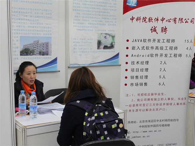 此次招聘会是中关村人才市场连续第4年组织用人单位进校招聘,为广大毕业生提供了涉及IT类、管理类等相关专业就业岗位800余个,受到同学们的广泛关注。