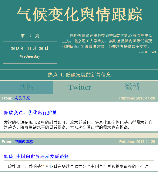 2013年11月11-23日,《联合国气候变化框架公约》第十九次缔约方会议(COP19)在波兰华沙举办,以国家发改委副主任解振华为团长的中国代表团共50余名专家参加了大会,就全球气候变化的多项议题展开谈判。在本次谈判大会召开期间,根据科技部中国21世纪议程管理中心的安排,我校自动化学院王庆林教授课题组利用自己开发的“气候变化领域知识本体及决策支持工具”向中国代表团成员提供了三期九份大会舆情热点分析报告,内容涵盖极端气候、发达国家与发展中国家的争论焦点、碳交易试点等多个主题。课题组基于气候变化领域知识本体对谈判期间的国内外新闻报道及微博、推特等社交网络的相关主题信息进行了系统抓取,及时挖掘国内外的舆情热点,并通过邮件快报和手机微信平台向中国代表团成员发布分析报告,使谈判专家可以及时掌握国内外舆情倾向,为谈判工作提供信息支持,取得了良好的效果。