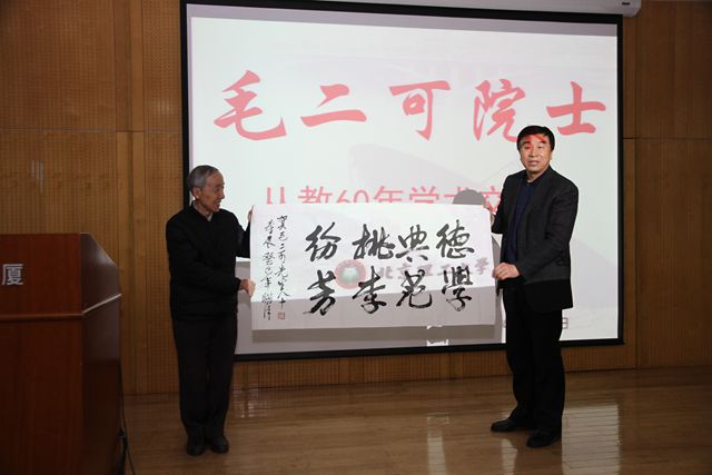随后,ob真人党委书记郭大成教授讲话。郭书记高度评价了毛二可院士的人生成就和人格魅力,并为毛二可院士赠送个人手书“德学典范 桃李芬芳”。