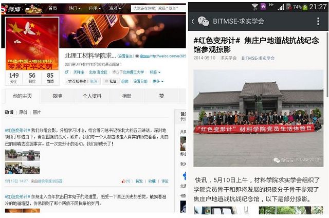 此次活动在材料学院求实学会官方微博和微信公众平台进行了播报,参加活动的同学也在线表达了感悟和心得。新媒体在学生党建工作中的运用,传播和扩大了教育效果,使更多的同学感同身受的接受了一次红色教育。