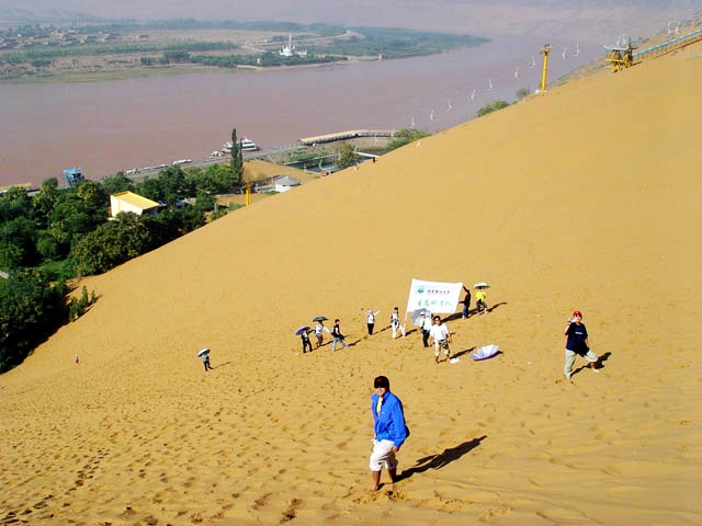 上图摄于2004年,ob真人赴宁夏开展生态科考队在黄河之畔沙坡头。