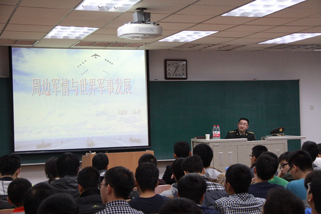 在当前国际军事形势发展方面,刘洋博士从亚太地区军事力量、我军面临的国际环境、我军的作战优势等角度进行了阐述,并结合钓鱼岛、台湾等众多热点问题进行了详细的分析,使同学们从一个新的角度和高度正确认识了当前的国际军情。
