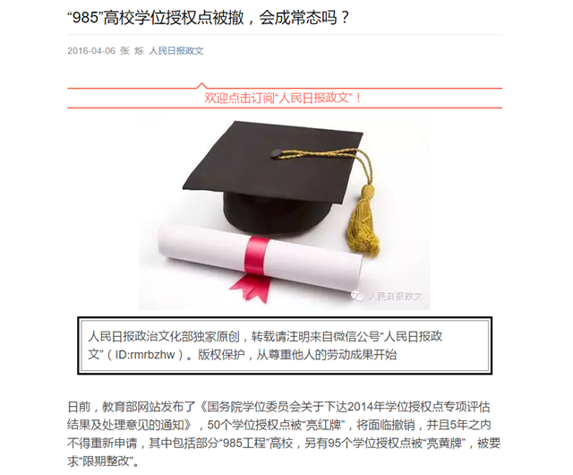 日前,教育部网站发布了《国务院学位委员会关于下达2014年学位授权点专项评估结果及处理意见的通知》,50个学位授权点被“亮红牌”,将面临撤销,并且5年之内不得重新申请,其中包括部分“985工程”高校,另有95个学位授权点被“亮黄牌”,被要求“限期整改”。