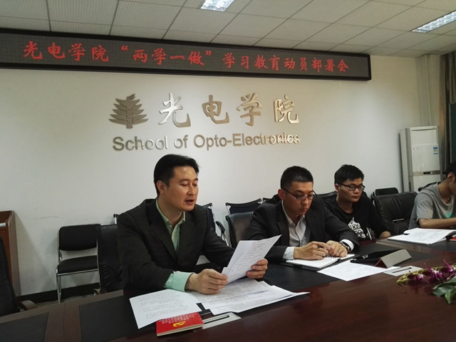 2016年5月10日下午,光电学院“两学一做”学习教育动员布置会在信息楼2023会议室召开。学校“两学一做”学习教育协调小组成员、学校办公室副主任荣新岩,光电学院党委书记郝群以及各个教工党支部书记、学生党支部书记参加了会议。会议由学院党委副书记、副院长邹锐主持。