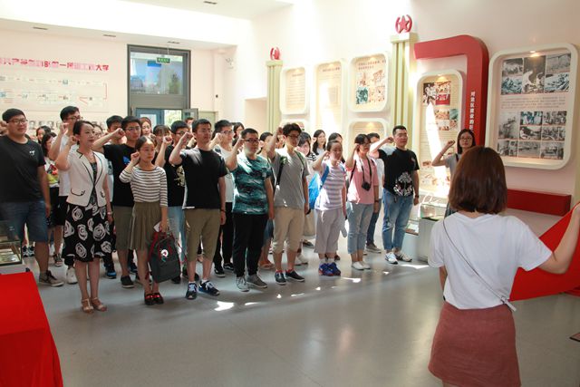 参观结束后,在校史馆大厅,全体党员面向党旗重温入党誓词。在党员代表迟昕凤同志的带领下,全体党员举起右手进行宣誓:“我志愿加入中国共产党……”,庄严而有力的声音回荡整个校史馆。通过重温入党誓词,使每一位党员的内心都受到了新的触动。