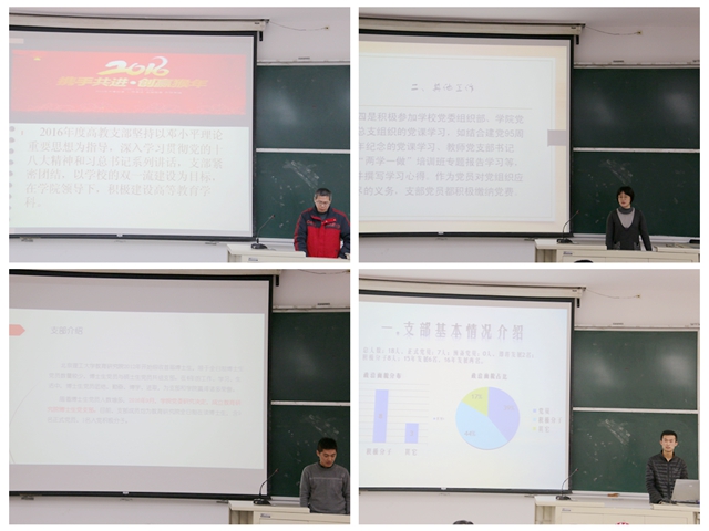 教工和学生党支部书记进行了述职,各支部基本围绕以下几点:支部成员及其发展情况;学习实践“两学一做”情况;支部党建工作情况;支部成员内部开展学习实践情况;工作中存在的问题及下一步工作计划。庞书记对各位支部书记的讲话进行了总结,并希望各支部高度重视支部建设,争取打造出每个支部自有的特色,并通过工作总结,归纳成绩、寻找差距、明确努力方向。