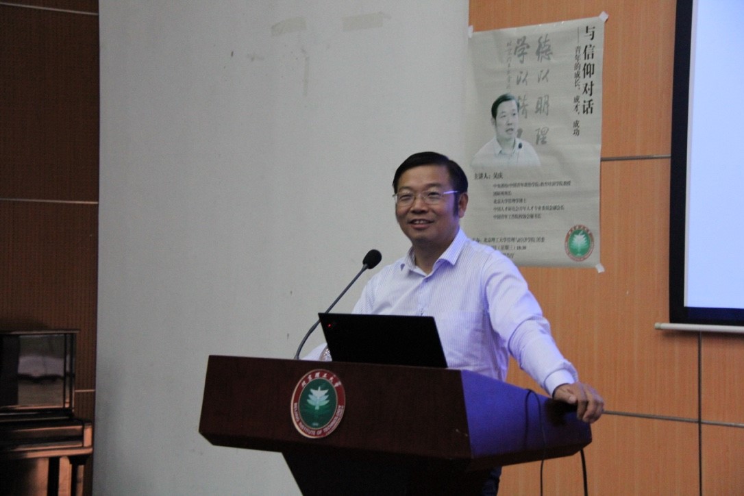 关于成长,吴老师认为青年的健康成长建立在认知青年自身的特点而回避其阶段性风险的基础之上。他回忆了对全国道德模范郭明义同志的访谈,生动地阐释了当代青年应当树立的价值观,他引经据典,以陈独秀先生的《敬告青年》揭示了当代青年群体应当承担的社会责任,并指出青年的选择对自身和社会的重要意义。关于成才,吴老师讲到青年的成才建立在青年把握成才规律,并努力实践的基础之上,他通过成才根基、成才主干、成才枝茂、成才环境四个方面,结合李克强总理的人生经历告诫同学们青年成长应当注重细节、求真务实、在人际关系中要注重宽容、培养高尚的道德风范,并不断反省自己。关于成功,吴老师强调青年的人生成功建立在对人生的幸福的参透的基础之上,他现场播放了歌曲《让世界因我而美丽》,并与在场的同学分享了自信对广大青年人生成功的重大作用。