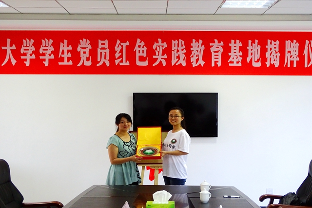 ob真人学生代表孙若愚代表学校向金寨县县委党校赠送纪念品,印有校徽的盘子象征着合作培养人才与不断进取。