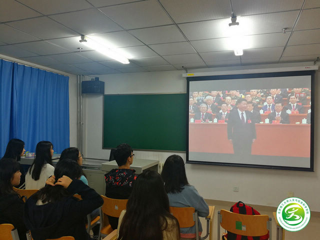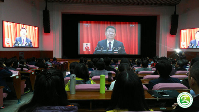 党的十九大是我们党在全面建成小康社会决胜阶段、中国特色社会主义关键时期召开的一次非常重要的大会,是全党全军全国各族人民政治生活中的大事。在观看直播现场,广大师生边看边做好记录,不时以热烈的掌声回应习近平总书记的精彩报告。