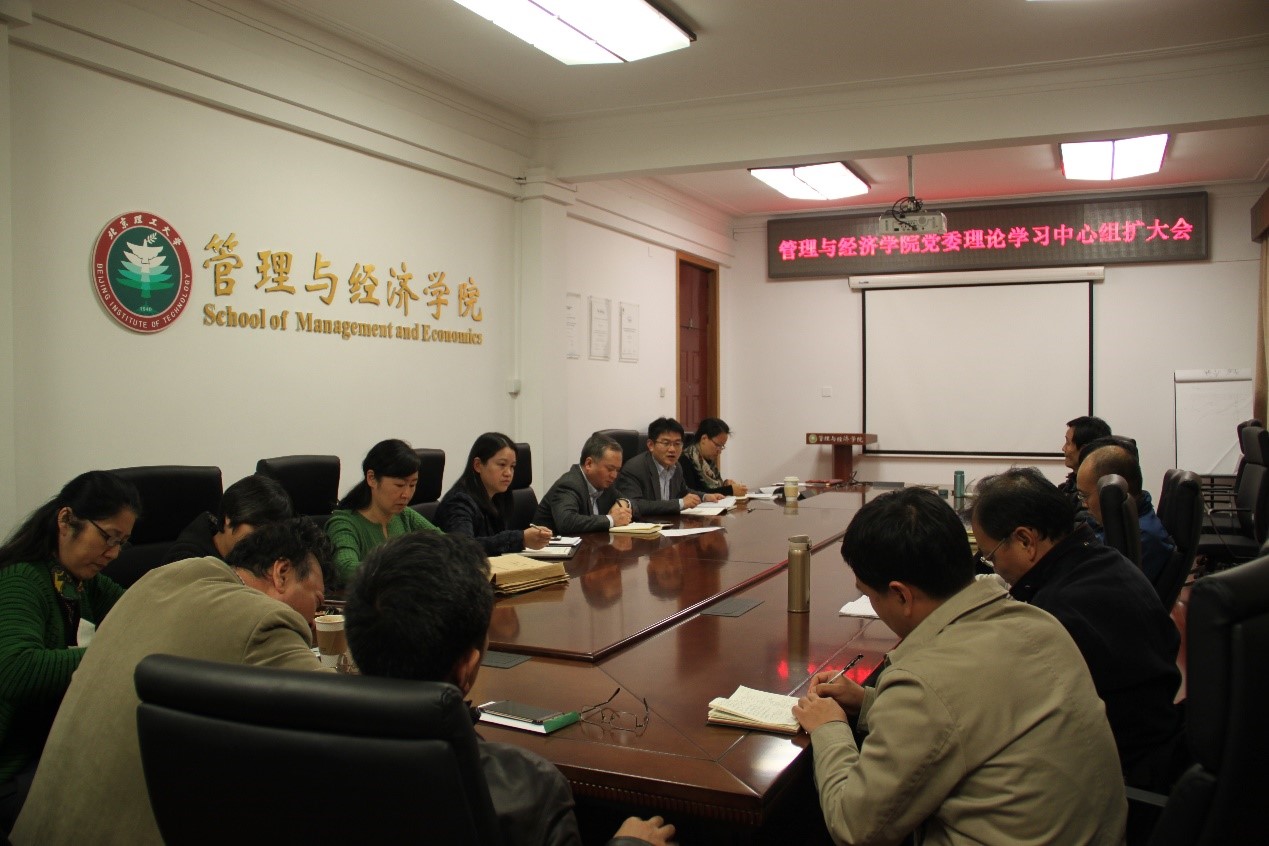 10月30日下午,管理与经济学院党委在主楼317会议室召开理论学习中心组扩大会议,集中学习传达了十九大精神,研究部署学院党委全面学习宣传贯彻党的十九大精神工作;并就近期学校党委工作重点进行传达和部署。学院理论学习中心组成员及教师党支部书记参加会议。会议由学院副书记、副院长彭明雪主持。