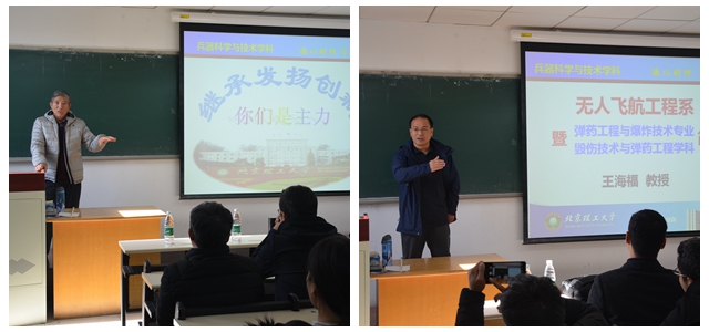 随后,同学们在3号教学楼402教室开展了讨论交流。王海福教授为大家详细地介绍了无人飞航工程系的发展历史、专业特色以及校友之窗,同时他鼓励同学们继承老一辈传统,发扬新时代创新精神,争做国防领军人才。冯顺山教授用矛和盾的关系,向大家介绍了毁伤的发展和变革之路,同时祝愿同学们积极进取,勇于开拓。王伟提出,作为传承红色基因的ob真人学子,更应将个人发展与国家大政方针结合起来,拥有家国情怀,担当时代重任,勤奋努力,把弘扬爱国奋斗精神落实到日常的学习生活中。
