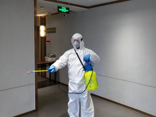 招待所公共区域消毒与垃圾处理每次都需要两三个小时,孙彪每天要重复三到四次,防护服包裹下的衣衫湿了又干,干了又湿,由于戴着口罩,护目镜又经常被汗水打湿,模糊地看不清前方的路。年近50、身形瘦小的孙彪,每次都要背着满满一大桶消毒液在招待所一到六层上上下下,同事们看在眼里,疼在心中,当劝说他换个人休息一下时,孙彪总是朴实的笑着说:“这种事还是让我们有经验又有劲儿的男同志来干吧!”