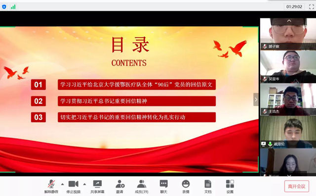 在学习讨论环节中,支部成员疏亚伦领学了习近平总书记给北京大学援鄂医疗队全体“90后”党员重要回信精神,部分团员代表结合自己在疫情期间的所见所感,分享了对总书记回信精神的学习心得。随后,同学们围绕如何践行总书记回信精神与德育导师项昌乐院士进行深入交流。