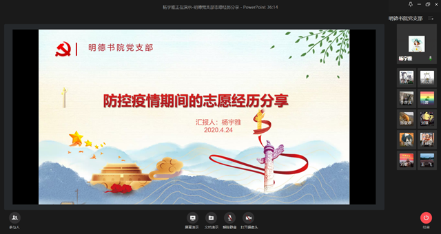 为深入学习贯彻习近平总书记重要回信精神,持续推进新时代爱国主义教育,积极响应“担复兴大任,做时代新人”主题教育活动号召,教育引导广大青年党员将习近平总书记回信精神作为人生指引,以实际行动升华学习成果、笃行强国使命,4月24日,明德书院党支部开展“共学回信精神,同担时代大任”线上主题党日活动,支部全体党员参加了此次活动。活动主要分为学习习近平总书记回信,分享个人抗“疫”故事以及主题讨论三个部分。党员们学习理论、交流想法、畅所欲言,收获颇丰。