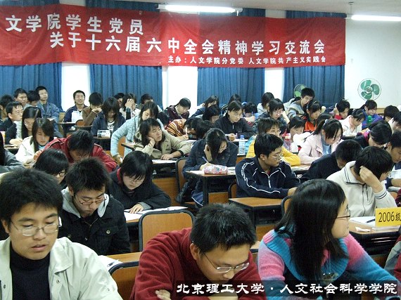 为响应人文学院分党委的号召,深入学习十六届六中全会精神,人文学院共产主义实践会组织举办了全院学生党员的学习交流会。10月27日下午四点三十分,会议在一号楼110室隆重举行。