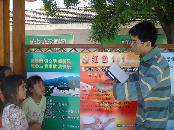为了进一步弘扬以“八荣八耻”为主要内容的社会主义荣辱观,充分发挥大学生党员志愿服务社会、服务新农村建设的积极性,2008年6月1日上午,机械与车辆工程学院3061党支部来到顺义区北务镇陈辛庄村开展了党员红色“1+1”活动。这次活动的主要目的是向村民宣传奥运,普及有关奥运方面的一些知识,通过这样的活动形式来了解农村、服务农村。