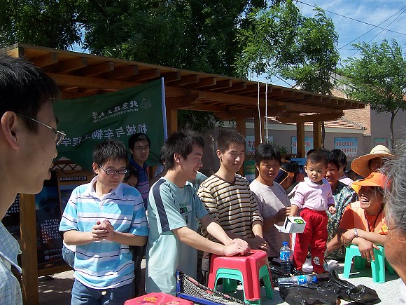 同时,在旁边的乒乓球台上,几名同学进行着奥运知识有奖竞答活动,村民们都积极踊跃的参加。我们带去了一些小的生活用品,如衣架、坐垫、小凳子等,村民们只要能答对提问,就会得到一个小礼品。有一位老大爷对奥运知识知道的较多,对好多题目他都能够准确的答出;还有几个小女孩也时常能回答几个问题,还给大家表演了唱歌。就这样村民们在欢声笑语中学到了一些关于奥运的知识,活动大约进行了两个小时,顺利结束了。