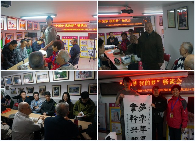 为了增进在思想上的交流,10月23日,双方党支部组织开展了“中国梦·我的梦”畅谈会,就对“中国梦”的认识和如何在平时生活中践行“中国梦”进行了深入交流。畅谈会上,社区党支部的长者们结合“中国梦”向第二党支部的大学生们讲述了年轻时的故事,分享人生感悟,并提出了“修身、务实、走群众路线”的殷切期望。曹华老同志还现场填词一首《相见欢》:“今又讲台教楼,岁月悠,借得长案,相对话题稠。青春灿,斗志焕,即出手。国富民强,梦圆凭劲头。”关老同志更是现场演唱了《我和我的祖国》。畅谈会结束后,社区党支部的老同志们还赠以“梦牵华夏,实干兴邦”、“大展宏图”等多幅书法作品,以此表达对大学生党员的勉励与希冀之情。
