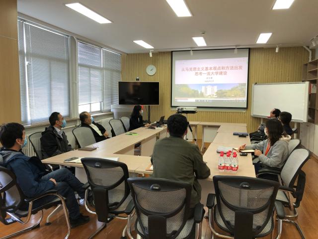 3月31日,马克思主义学院党总支理论中心组学习在中关村校区中心教学楼1302进行,部分成员在线参加。学习由党总支书记兼院长刘存福主持。