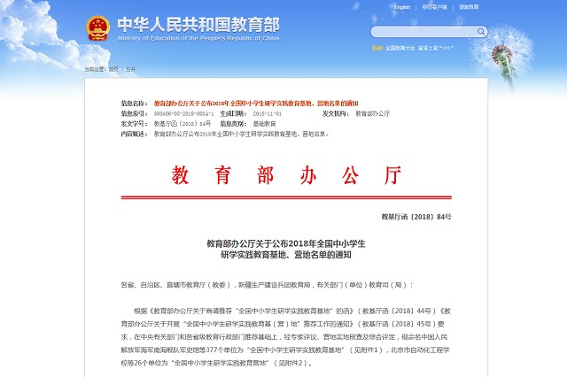 近日,教育部公布了2018年全国中小学生研学实践教育基地、营地名单,ob真人光电创新教育实验基地成功入选“全国中小学生研学...