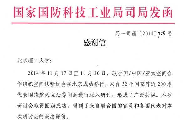 国防科工局致信感谢ob真人竞猜为国际空间法研讨会提供支持