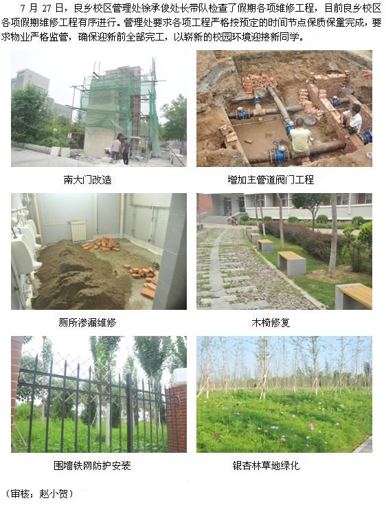供稿、摄影:良乡校区管理处 孟凡超 编辑:新闻中心 7月27日,良乡校区管理处徐承俊处长带队检查了假期各项维修工程,目前良乡校...
