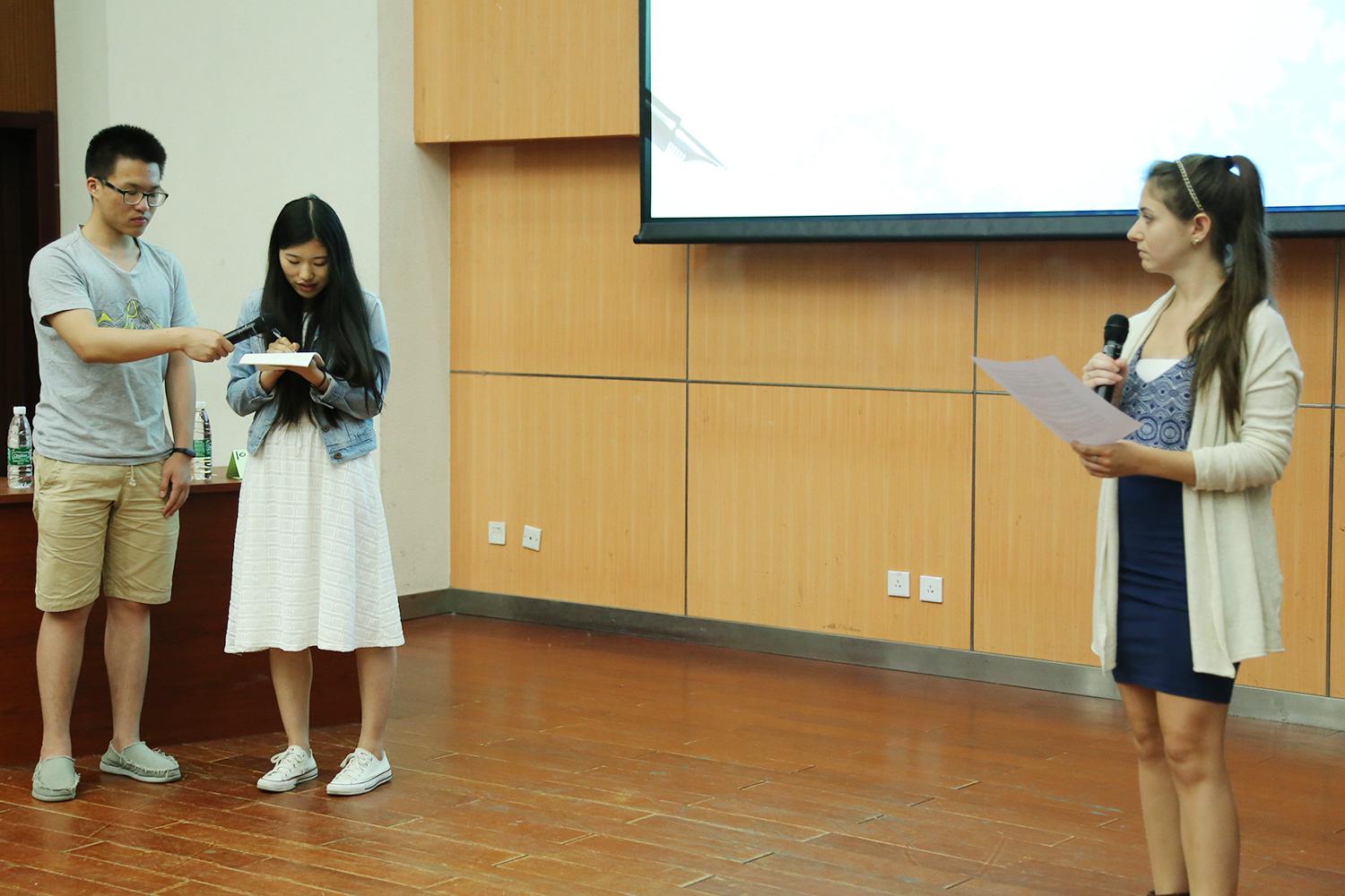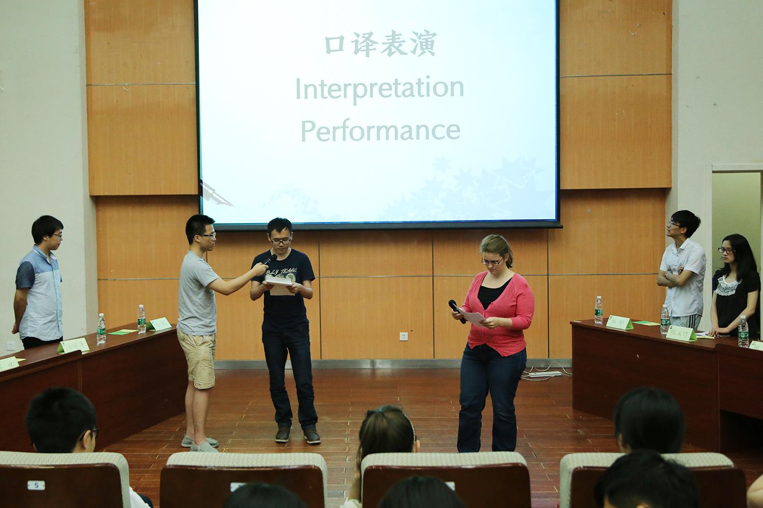 在最后一个环节比赛开始前,两位来自翻译专业的研究生叶芷、黎奇与两位外教评委合作进行了精彩的口译表演,让现场观众们近距离感受了口译的魅力。