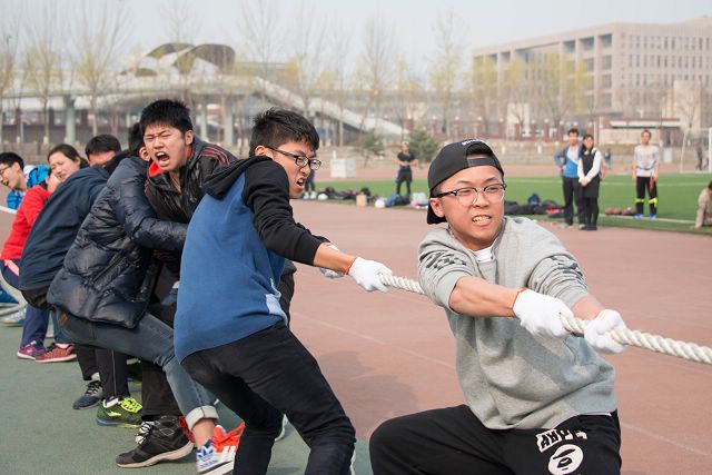 在拔河比赛中,当比赛的哨声一响起,队员们口中齐呼“一二,一二”,双手紧握长绳,憋足了劲拼命往后拉,班级内其他同学自发组成啦啦队为本班队员加油。号子声、呐喊声,此起彼伏,飘荡在整个足球场上空。最终,大二高分子二班力压群雄,夺得桂冠。