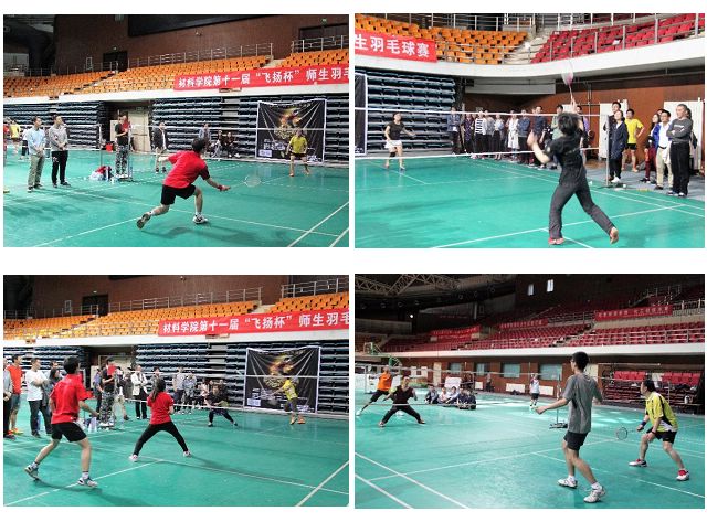 师生羽共,激情飞扬。4月20日至27日,ob真人竞猜材料学院第十一届“飞扬杯”师生羽毛球赛在ob真人体育馆火热举行。“飞扬杯”是材料学院的传统体育赛事,本届羽毛球赛由材料学院研究生会主办,活动得到了学院广大师生的大力支持和踊跃参与。比赛采用团体赛形式,来自学院共十二支队伍百余名师生以课题组或班级等形式组队参加了男单、女单、男双、女双、混双多个项目的竞技。