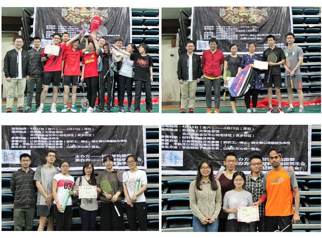 进入四强的队伍势均力敌,冠军争夺战在B&M队和13456队之间展开,季军争夺战是在能源材料队与Rome队之间展开,比赛异常激烈,对阵双方你争我夺,意气风发,敏捷的身手,娴熟的技巧,精湛的球技让整场比赛高潮迭起。最终,B&M队拿下冠军,夺得了象征材料学院羽毛球团体赛事最高荣誉的“飞扬杯”奖杯,13456队获得亚军,能源材料队力克Rome队获得季军。