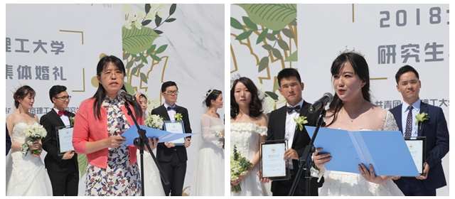 导师代表机电学院杨利教授为新人们送上了最诚挚的祝福,新人代表化学与化工学院博士生王珊代表本次婚礼的所有新人温情致谢。典礼最后,新娘们向现场的观众抛出了代表幸运和美好祝愿的手捧花,新郎和新娘们在许愿池倒下庆祝的香槟酒。