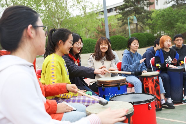 “鼓圈”活动是音乐团体心理辅导的一种形式,参与者能够在体验中获得心理成长。活动开始不久,同学们就逐渐找到了团体的节奏,敲击出和谐的旋律。之后,在张弩老师的引导下,同学们开始以创造性的方式进行演奏,在统一的节奏中表现出自己的独特性。活动过程中,同学们通过非言语的方式感受到了团体成员之间的联结与配合,在鼓声的共振中体验到了聆听与表达。