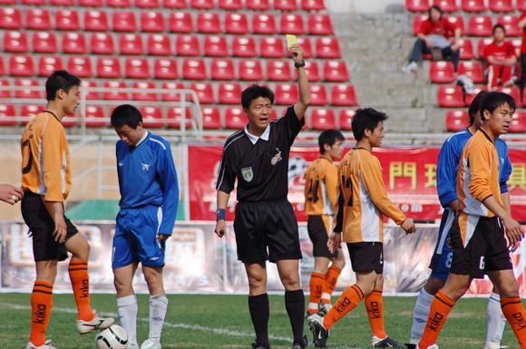 裁判员在向哈药毅腾队犯规队员出示黄牌警告。