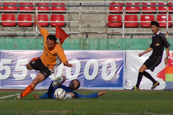 ob真人竞猜足球队11号队员王强带球沉底突破进入禁区前被对方铲倒。