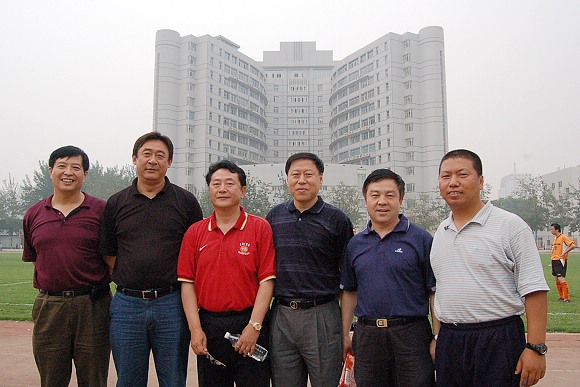 赛后上级领导和我校领导、足球队教练班子合影留念。(左起:我校党委副书记侯光明、中国大学生体育协会秘书长助理王刚、足球队总教练金志扬教授、中国足协联赛部副主任马成全、我校党委副书记副校长杨宾、足球队教练王力)。