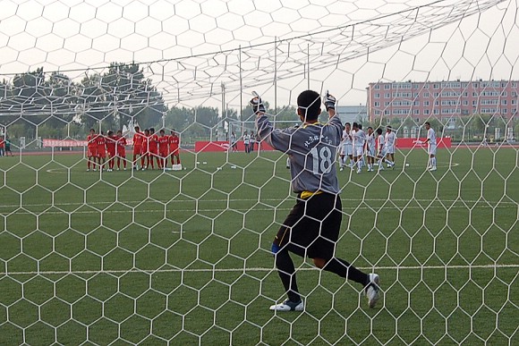 第四轮罚球,我方由8号队长袁微出场,他巧妙骗过对方守门员,点球命中。
