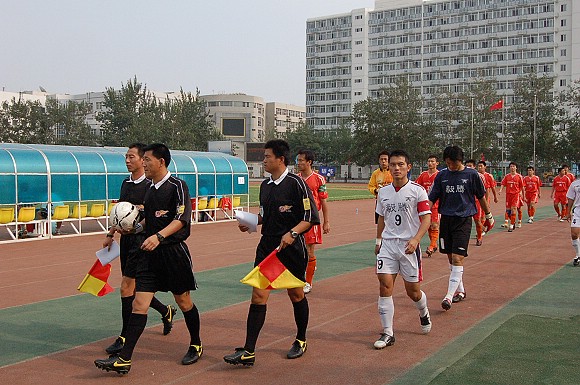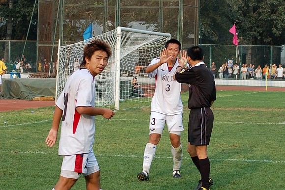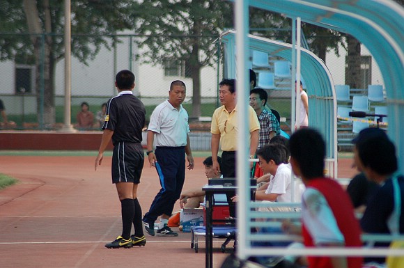 面对如此的偏袒行为,我校足球队总教练金志扬也忍耐不住,向第四裁判提出交涉。