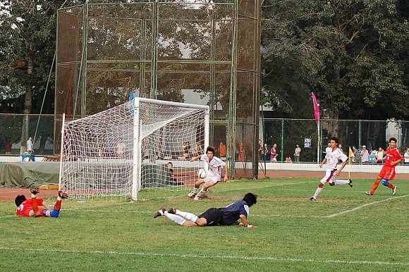 皮球划过一道弧线越过对方守门员头顶直入网底。