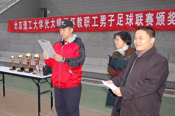在11月19日举行的ob真人竞猜“光大银行杯”第二届教职工男子足球联赛闭幕式上,党委副书记、工会主席侯光明到场并作了讲话,光大银行世纪城支行行长罗静、行长助理李亚林到场并观看了最后一轮比赛。