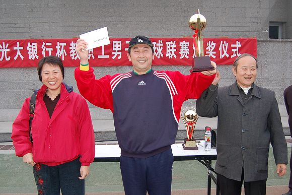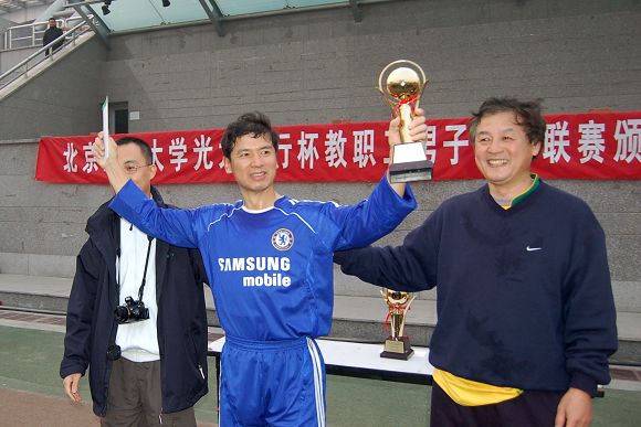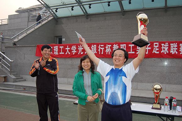 校教职工足球队队长王俊、光大银行世纪城支行行长助理李亚林为获得第三名的直属单位和生命科学与技术学院联队颁奖。
