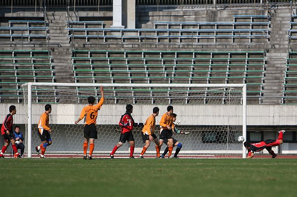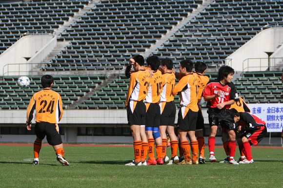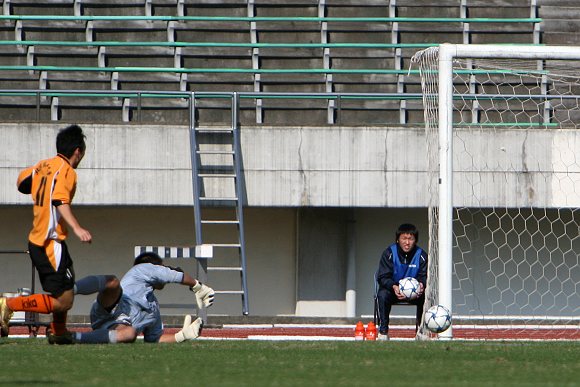 上半时比赛进行到第5分钟,驹泽大学队在禁区前沿获得了一个位置极好的任意球,罚球队员脚法极刁,一脚将皮球直接射入球门的右上角,率先打开了场上局面。