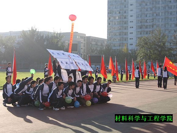 入场式上我院打出了“发扬奥运精神,展我材院风采“的标语表达志愿奥运的信心