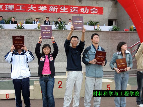 各学院在本次新生运动会中都赛出了风格、赛出了水平,一天的比赛很快画上了圆满的句号。我材料科学与工程学院新生们以良好的精神状态和赛场上的优异表现,赢得兄弟学院的广泛认同,喜获精神文明奖评比的第一名(图为学生会体育部长沈久臻同学〈左起第三人〉代表学院上台领奖)。