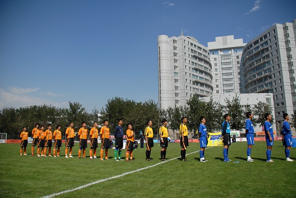 上半场前20分钟内,青岛队猛烈的攻势一直压制在学生军的后半场,第7分钟青岛队在爱国者大学生队大禁区前获得位置非常好的任意球,战术任意球直接射门,球稍稍高出横梁。第13分钟,青岛队通过娴熟的传切配合,攻入爱国者大学生队禁区,混乱中,由青岛队45号克劳迪内将皮球捅如球门,青岛队1:0先下一城。