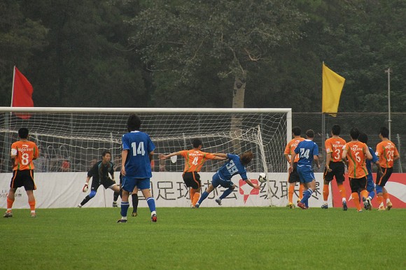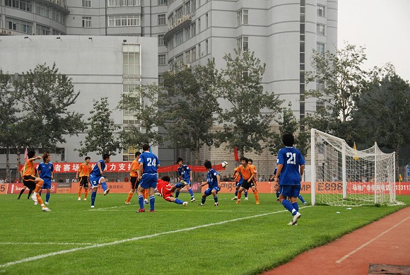 丢球后的北京爱国者队迅速展开反攻,大举压上造成对方后卫直接回传门将。但对方门将在禁区内玩火,头球停球不慎,只好将球解围出底线。