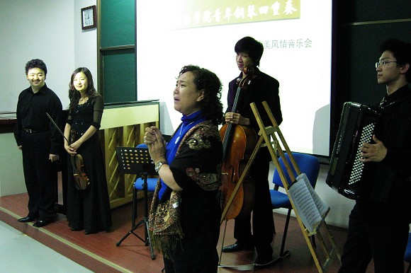 10月25日晚7时,2008艺术节项目:由中央音乐学院青年五重奏小组完成的“南美风情”室内音乐会在良乡校区理科教学楼304教室举行。整个教室座无虚席,观众兴致勃勃的欣赏了十九世纪德国著名作曲家孟德尔松以及俄国作曲家拉赫玛尼诺夫等音乐家的独、重奏作品。